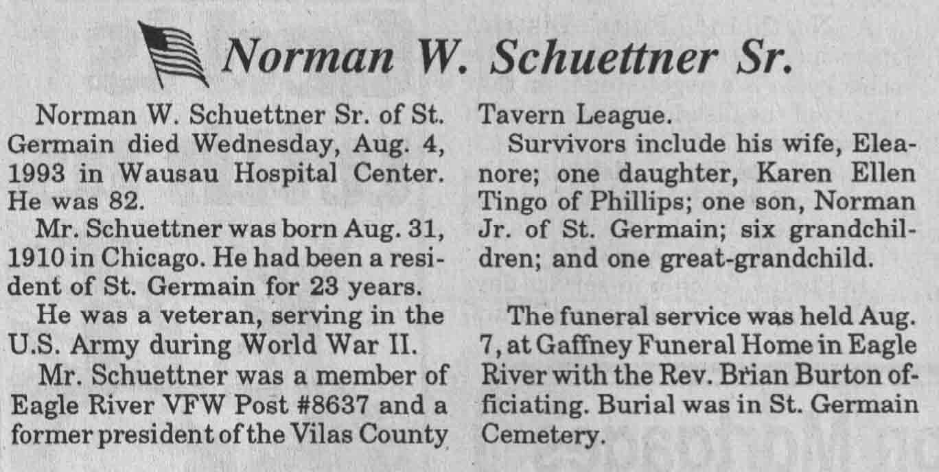 | Schuettner | Norman W, Sr | 31 Aug 1910 | 04 Aug 1993 | V N-R | 11 Aug 1993 | 4 |