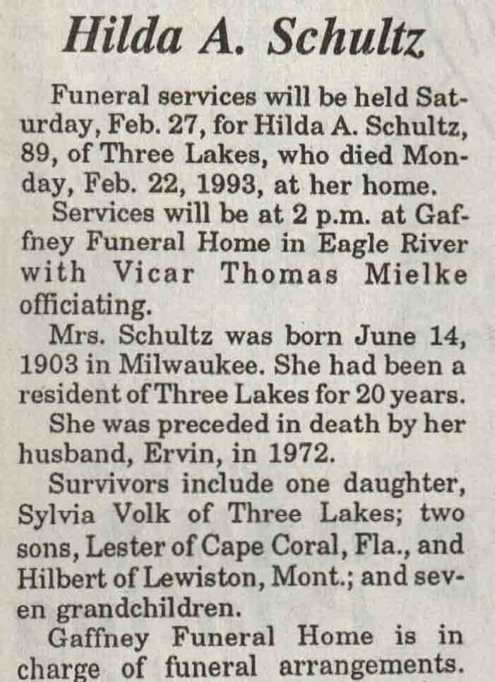 | Schultz | Hilda A | 14 Jun 1903 | 22 Feb 1993 | V N-R | 24 Feb 1993 | 4 |