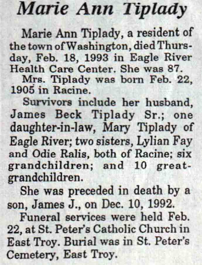 | Tiplady | Marie Ann | 22 Feb 1905 | 18 Feb 1993 | V N-R | 24 Feb 1993 | 4 |