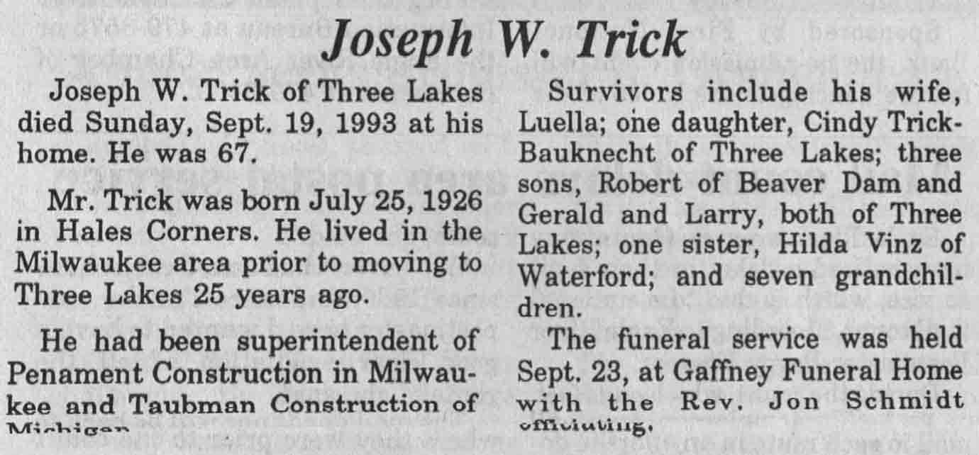 | Trick | Joseph W #2 | 25 Jul 1926 | 19 Sep 1993 | V N-R | 29 Sep 1993 | 4 |