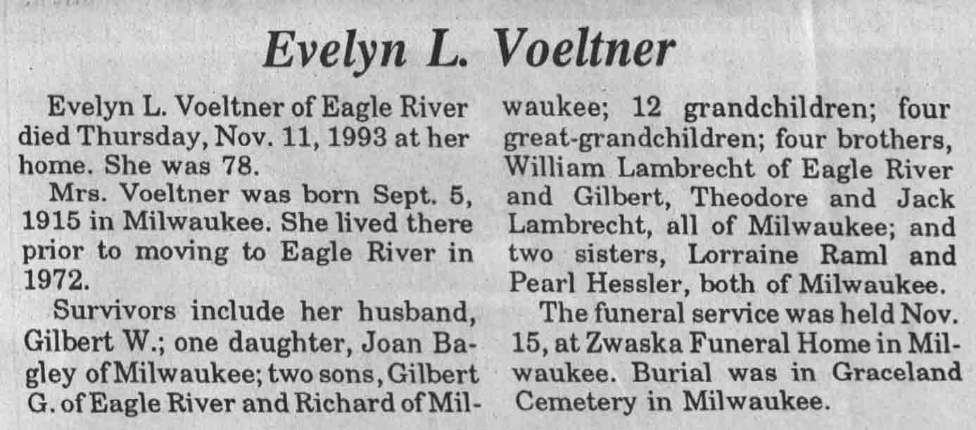 | Voeltner | Evelyn L (Lambrecht) | 05 Sep 1915 | 11 Nov 1993 | V N-R | 17 Nov 1993 | 4 |