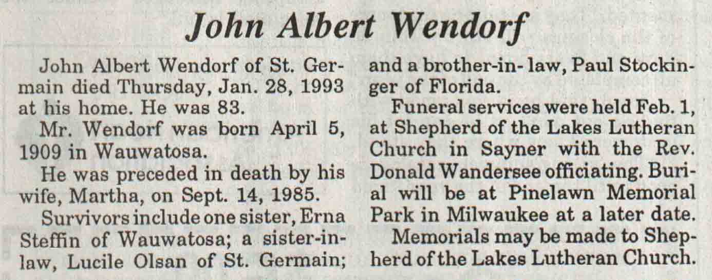 | Wendorf | John Albert | 05 Apr 1909 | 28 Jan 1993 | V N-R | 03 Feb 1993 | 4 |