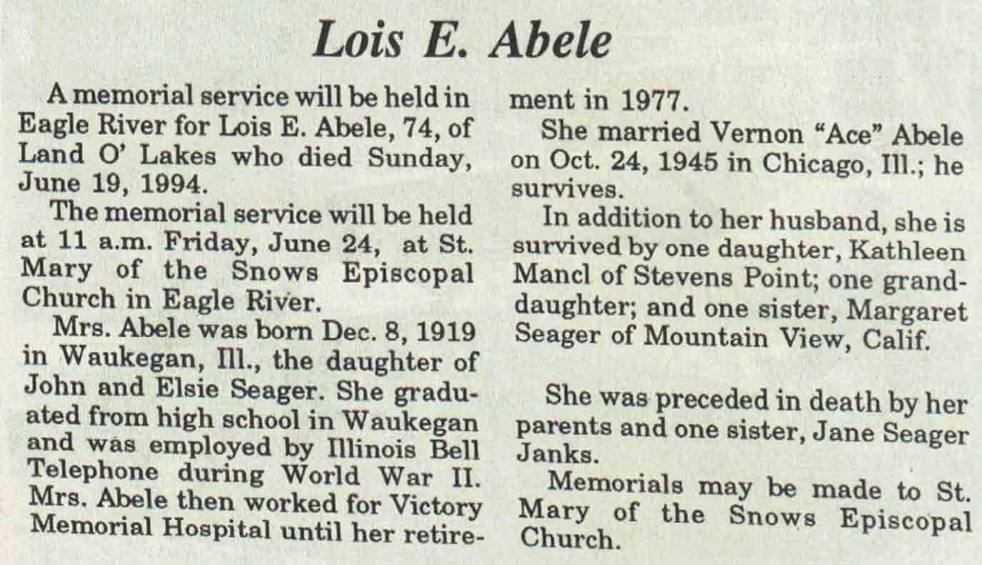| Abele | Lois E (SeageR) | 08 Dec 1919 | 14 Jun 1994 | V N-R | 22 Jun 1994 | 4 |
