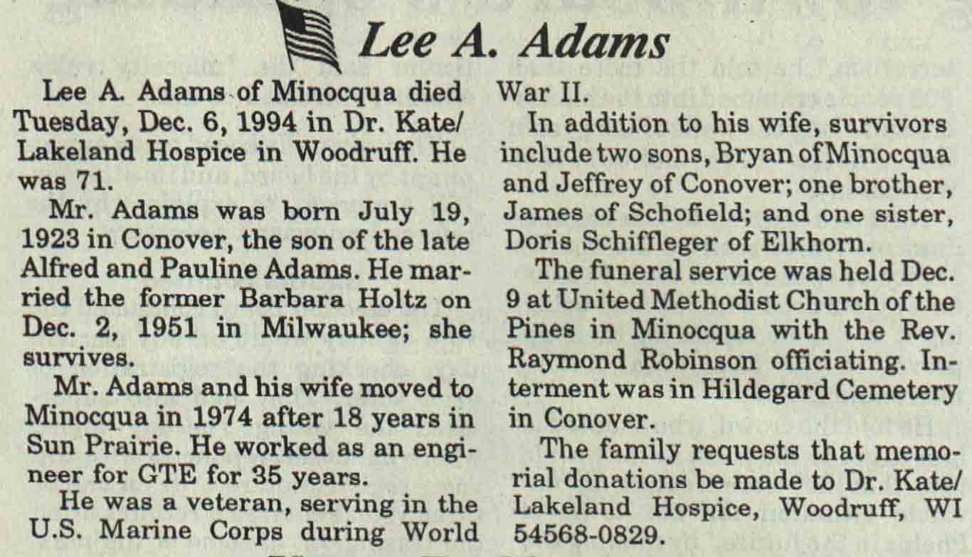 | Adams | Lee A | 19 Jul 1923 | 06 Dec 1994 | V N-R | 14 Dec 1994 | 4 |