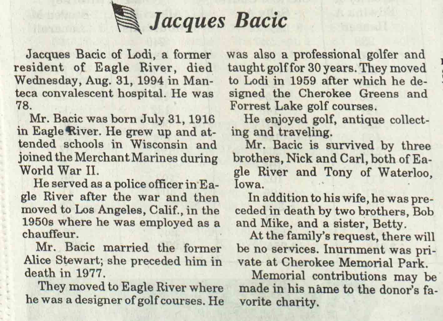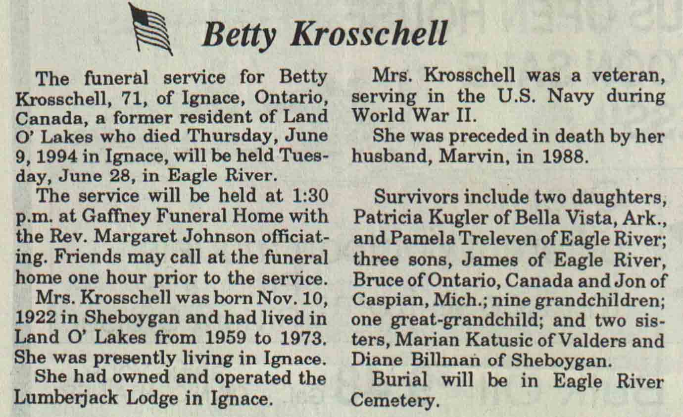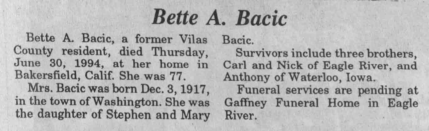 | Bacic | Bette A | 03 Dec 1917 | 30 Jun 1994 | V N-R | 06 Jul 1994 | 4 |