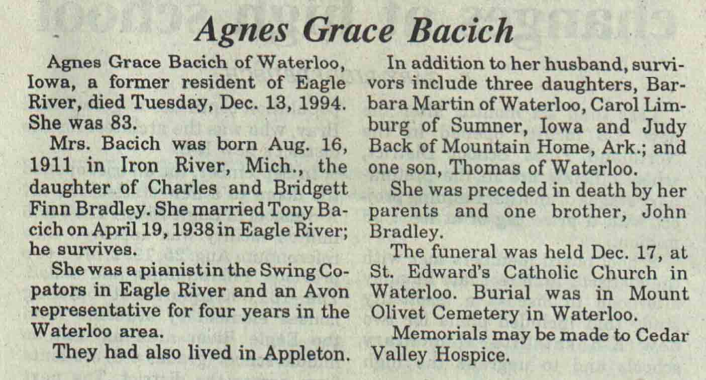 | Bacich | Agnes Grace (Bradley) | 16 Aug 1911 | 13 Dec 1994 | V N-R | 21 Dec 1994 | 4 |