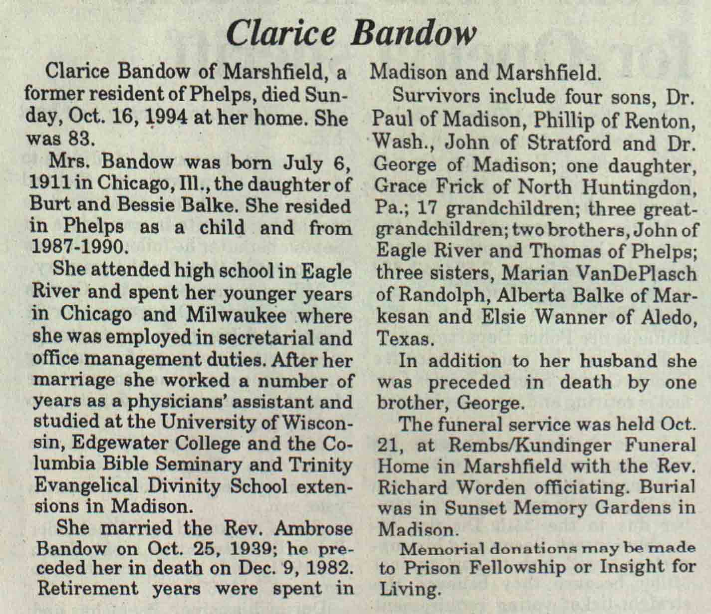 | Bandow | Clarice (Balke) | 06 Jul 1911 | 16 Oct 1994 | V N-R | 02 Nov 1994 | 4 |