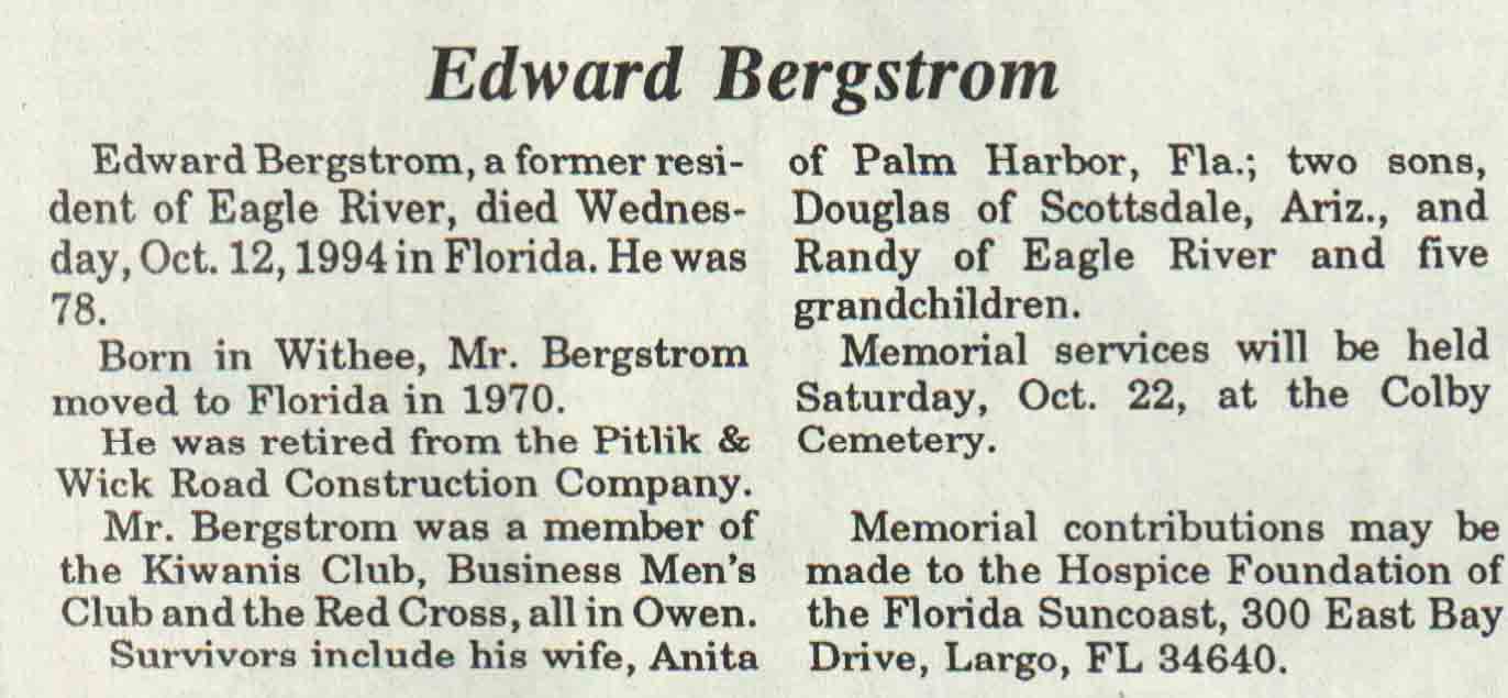 | Bergstrom | Edward | c 1916 | 12 Oct 1994 | V N-R | 19 Oct 1994 | 4 |