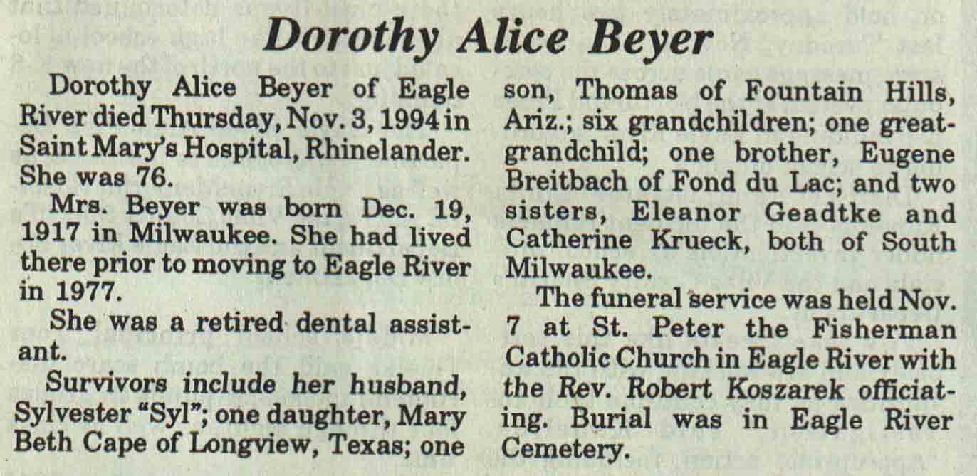 | Beyer | Dorothy Alice (Breitbach) | 19 Dec 1917 | 03 Nov 1994 | V N-R | 09 Nov 1994 | 4 |
