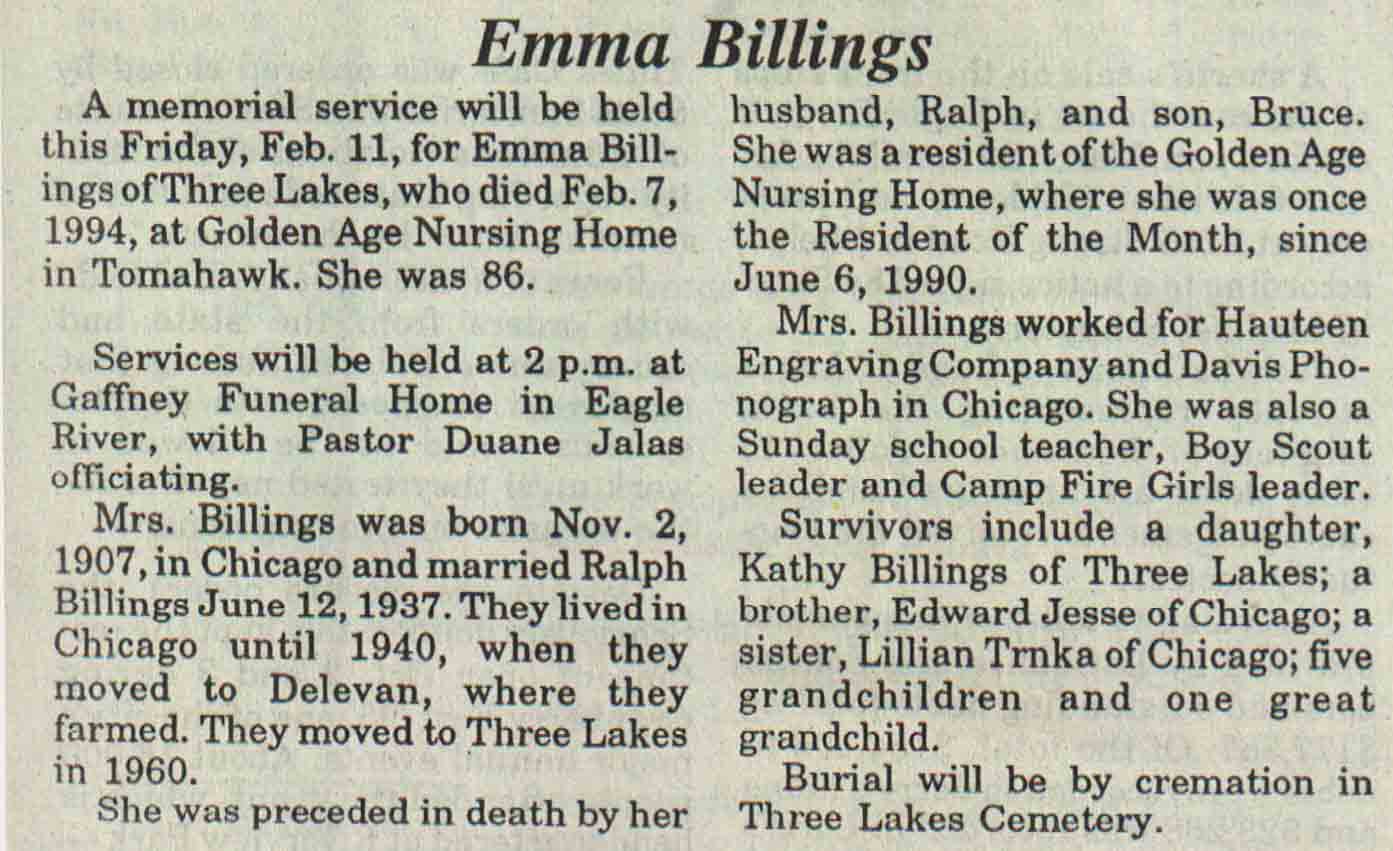 | Billings | Emma (Jesse) | 02 Nov 1907 | 07 Feb 1994 | V N-R | 09 Feb 1994 | 4 |