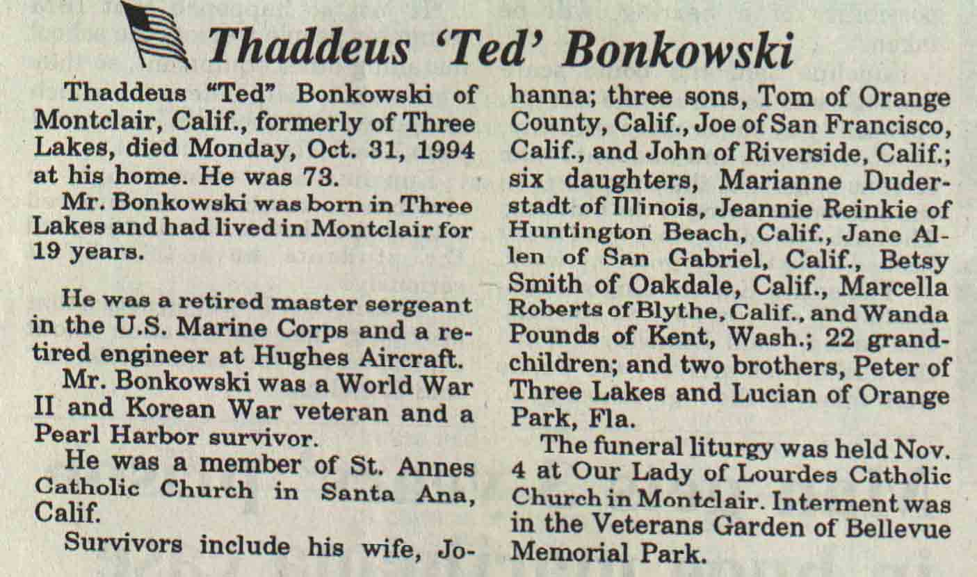 | Bonkowski | Thaddeus 'Ted' | c 1921 | 31 Oct 1994 | V N-R | 09 Nov 1994 | 4 |