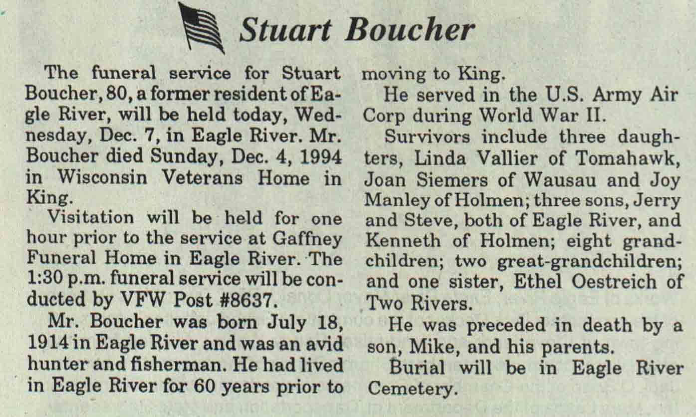 | Boucher | Stuart | 18 Jul 1914 | 04 Dec 1994 | V N-R | 07 Dec 1994 | 4 |