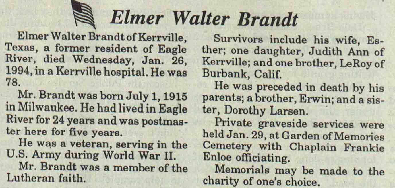 | Brandt | Elmer Walter | 01 Jul 1915 | 26 Jan 1994 | V N-R | 02 Feb 1994 | 4 |