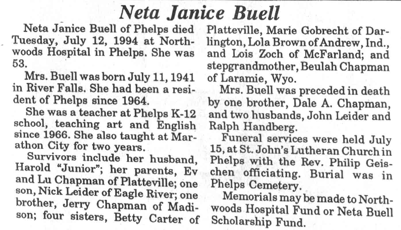 | Buell | Neta Janice (Chapman) | 11 Jul 1941 | 12 Jul 1994 | V N-R | 20 Jul 1994 | 4 |