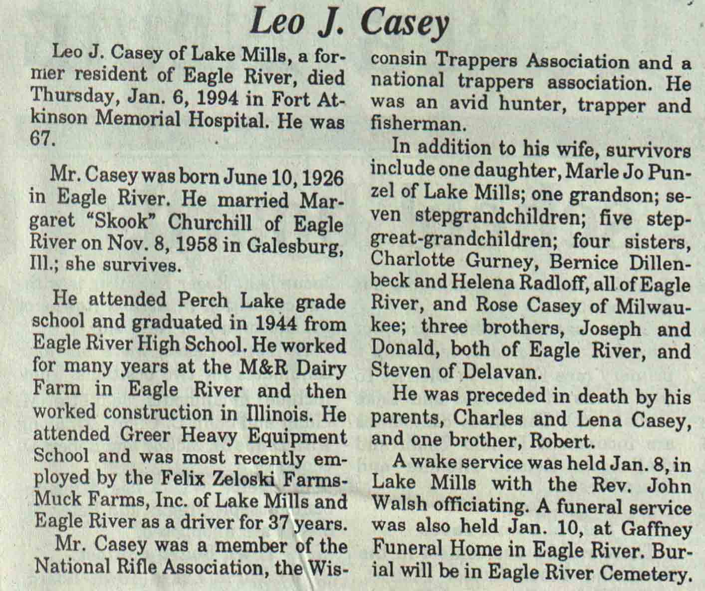| Casey | Leo J #1 | 10 Jun 1926 | 06 Jan 1994 | V N-R | 12 Jan 1994 | 8 |