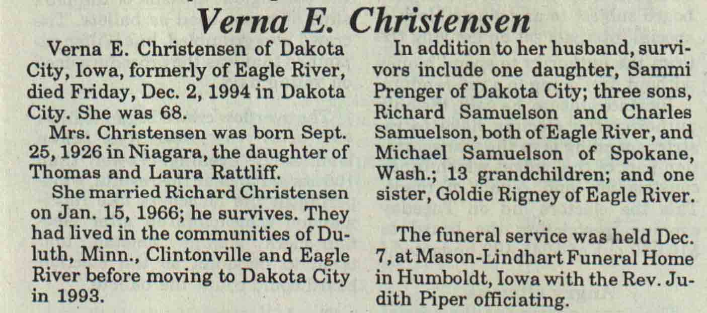 | Christensen | Verna E (Rattliff) | 25 Sep 1926 | 02 Dec 1994 | V N-R | 14 Dec 1994 | 4 |