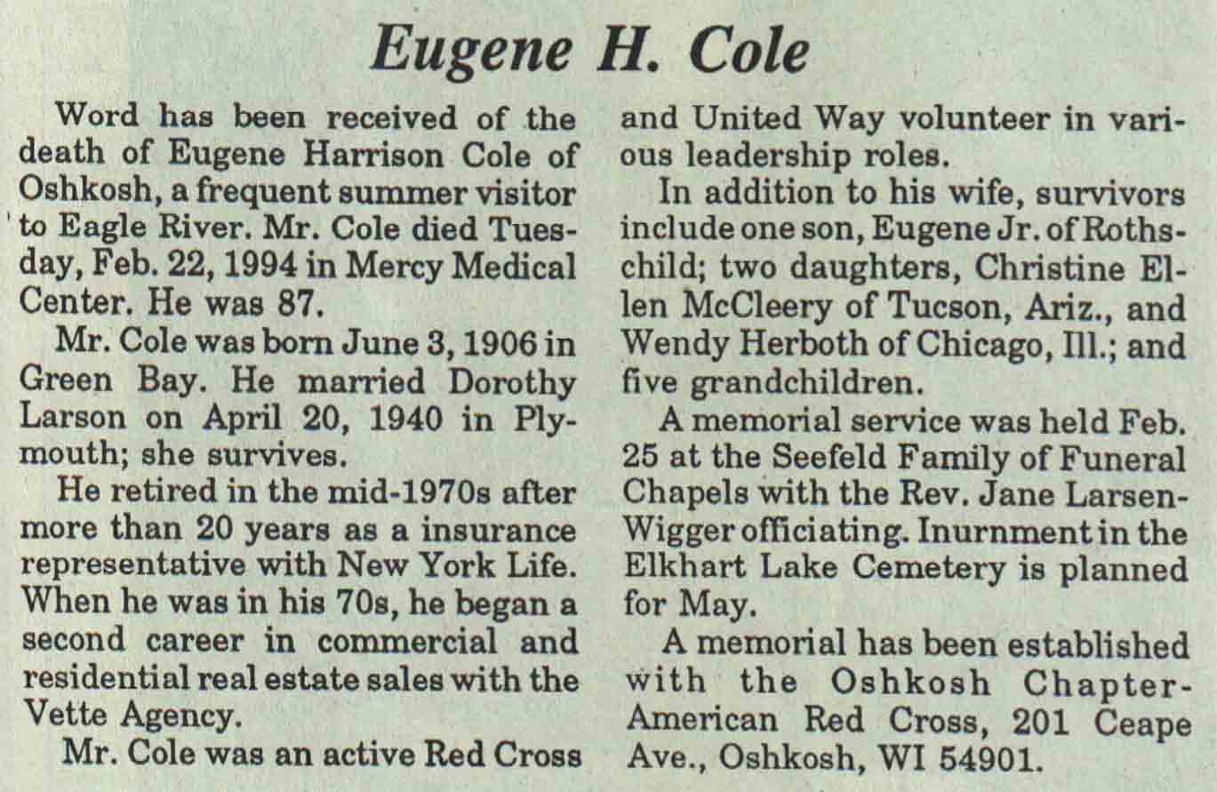 | Cole | Eugene H | 03 Jun 1906 | 22 Feb 1994 | V N-R | 23 Mar 1994 | 4 |