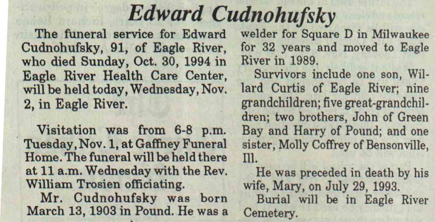 | Cudnohufsky | Edward | 13 Mar 1903 | 28 Oct 1994 | V N-R | 02 Nov 1994 | 4 |