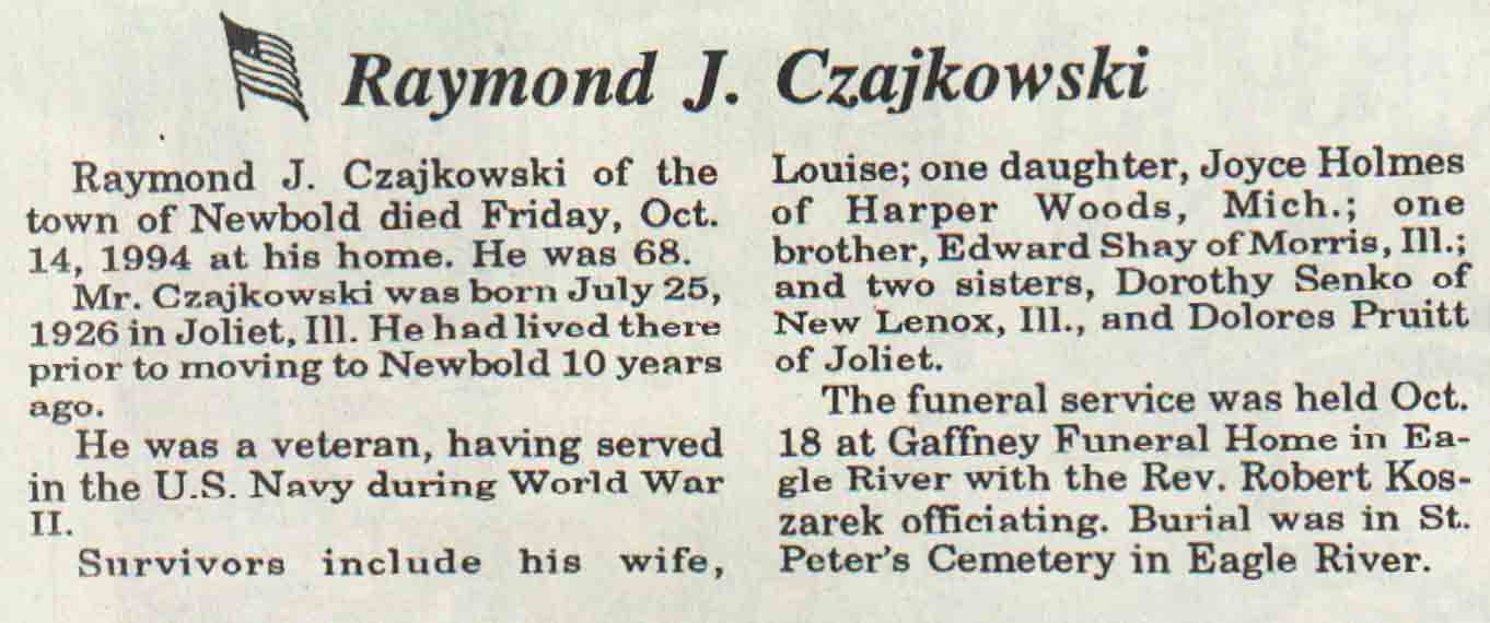 | Czajkowski | Raymond J | 25 Jul 1926 | 14 Oct 1994 | V N-R | 19 Oct 1994 | 4 |