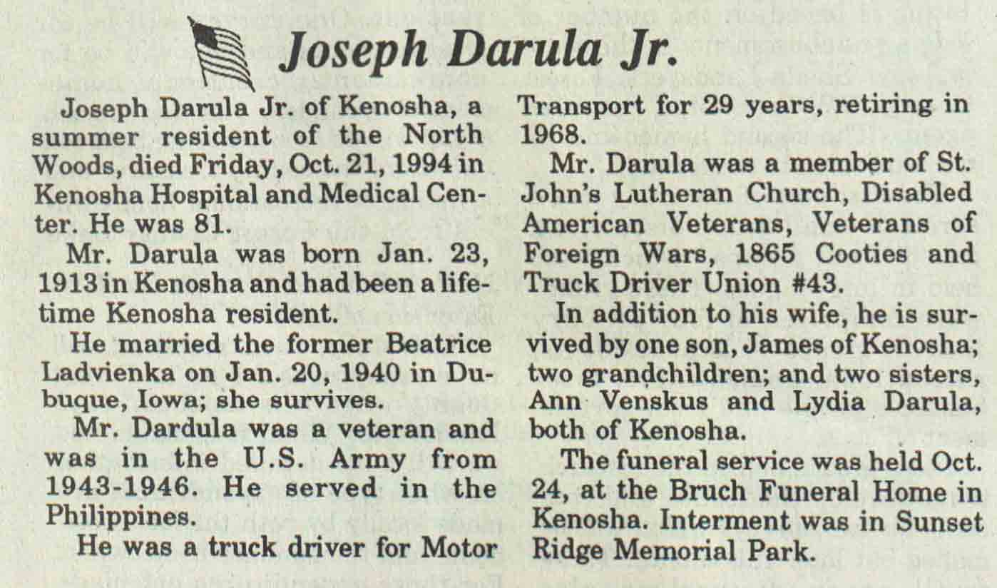 | Darula | Joseph, Jr | 23 Jan 1913 | 21 Oct 1994 | V N-R | 26 Oct 1994 | 4 |