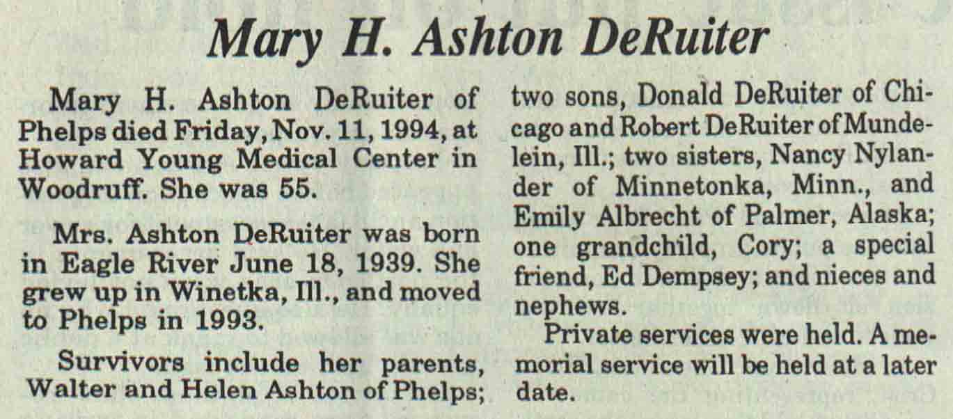 | DeRuiter | Mary H (Ashton) | 18 Jun 1939 | 11 Nov 1994 | V N-R | 16 Nov 1994 | 4 |