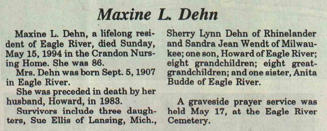 | Dehn | Maxine L | 05 Sep 1907 | 15 May 1994 | V N-R | 18 May 1994 | 4 |
