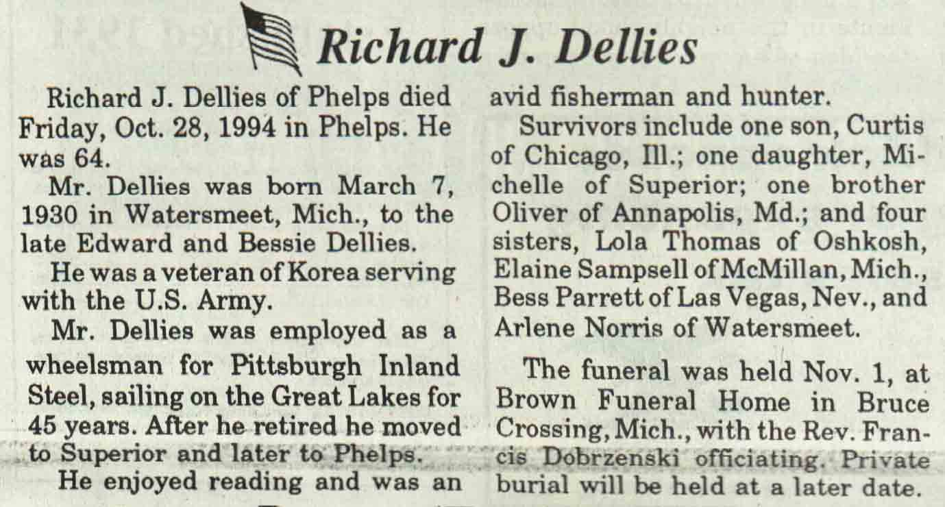 | Dellies | Richard J | 07 Mar 1930 | 28 Oct 1994 | V N-R | 02 Nov 1994 | 4 |
