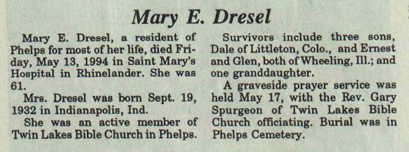 | Dresel | Mary E | 19 Sep 1932 | 13 May 1994 | V N-R | 18 May 1994 | 4 |