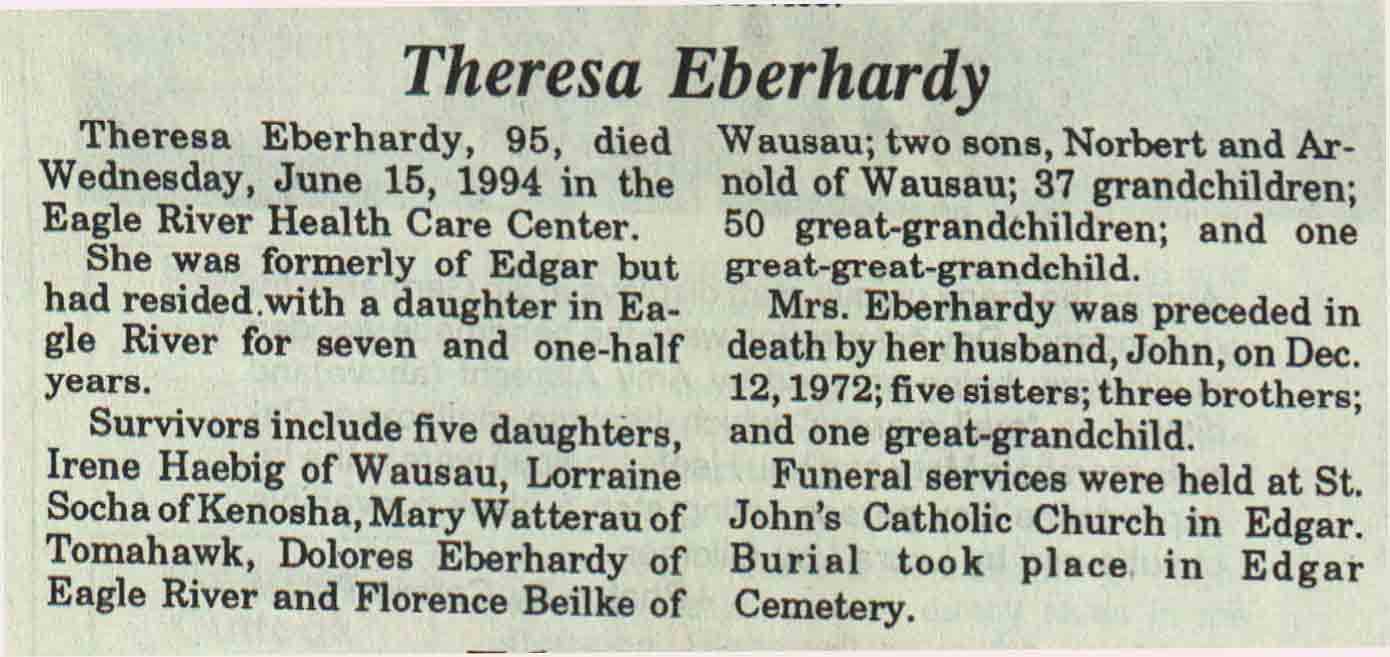 | Eberhardy | Theresa | c 1899 | 15 Jun 1994 | V N-R | 29 Jun 1994 | 4 |