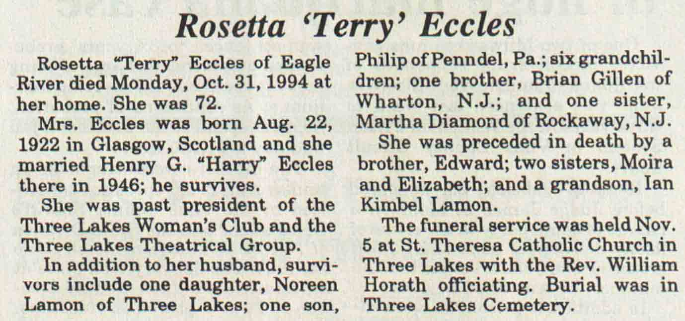 | Eccles | Rosetta 'Terry' (Gillen) | 22 Aug 1922 | 31 Oct 1994 | V N-R | 09 Nov 1994 | 4 |