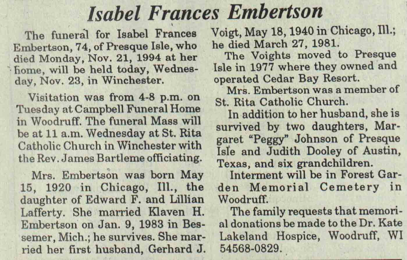 | Embertson | Isabel Frances (Lafferty) | 15 May 1920 | 21 Nov 1994 | V N-R | 23 Nov 1994 | 4 |