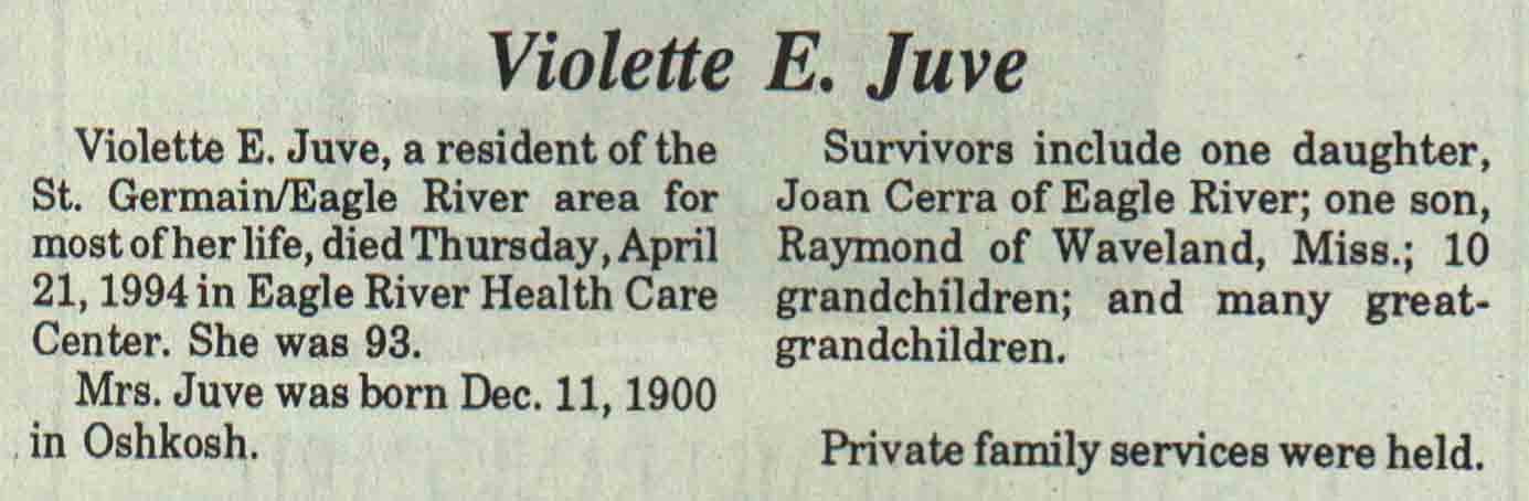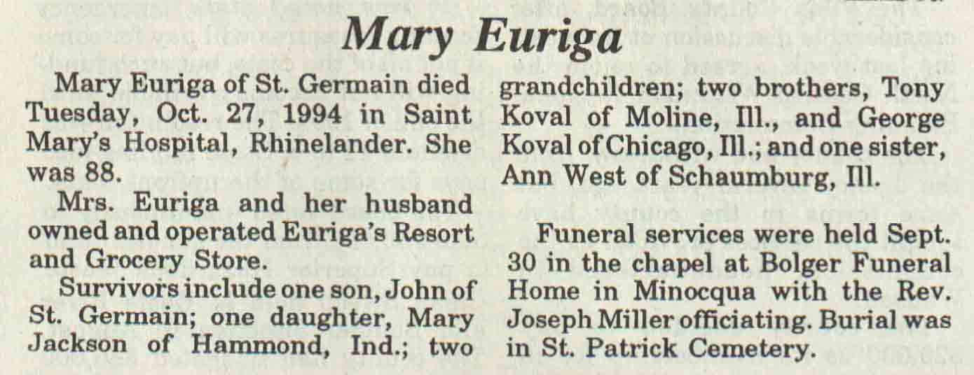 | Euriga | Mary (Koval) | c 1906 | 02 Oct 1994 | V N-R | 05 Oct 1994 | 4 |