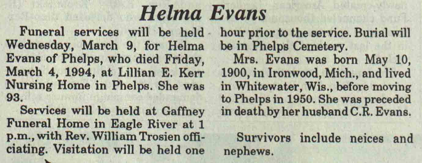 | Evans | Helma | 10 May 1900 | 04 Mar 1994 | V N-R | 09 Mar 1994 | 4 |