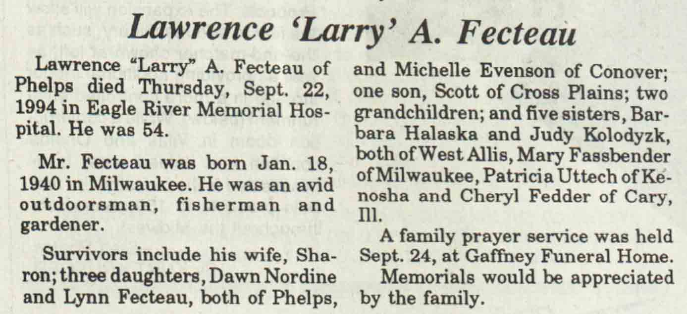 | Fecteau | Lawrence A 'Larry' | 18 Jan 1940 | 22 Sep 1994 | V N-R | 28 Sep 1994 | 4 |