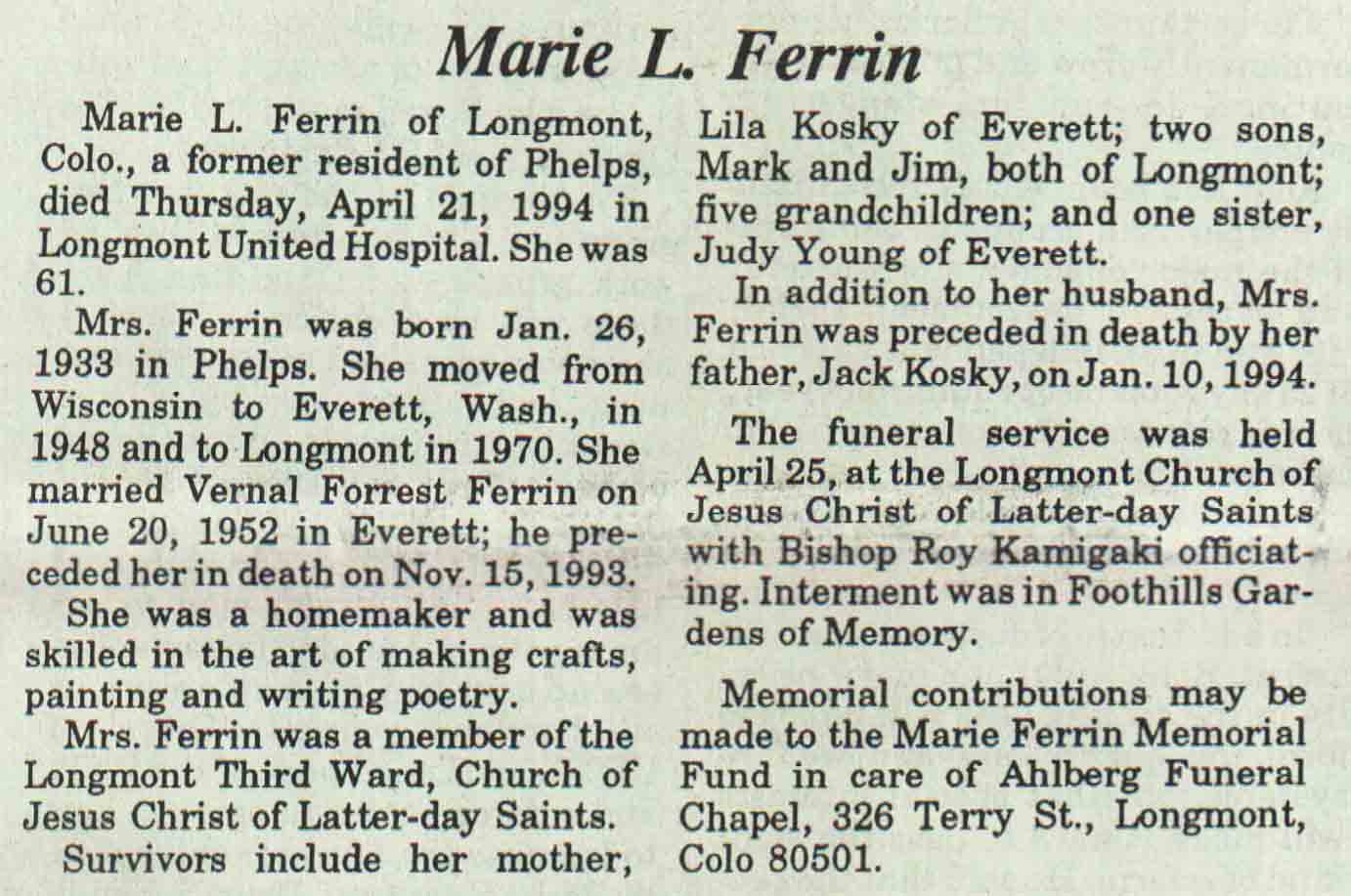 | Ferrin | Marie L | 26 Jan 1933 | 21 Apr 1994 | V N-R | 27 Apr 1994 | 4 |