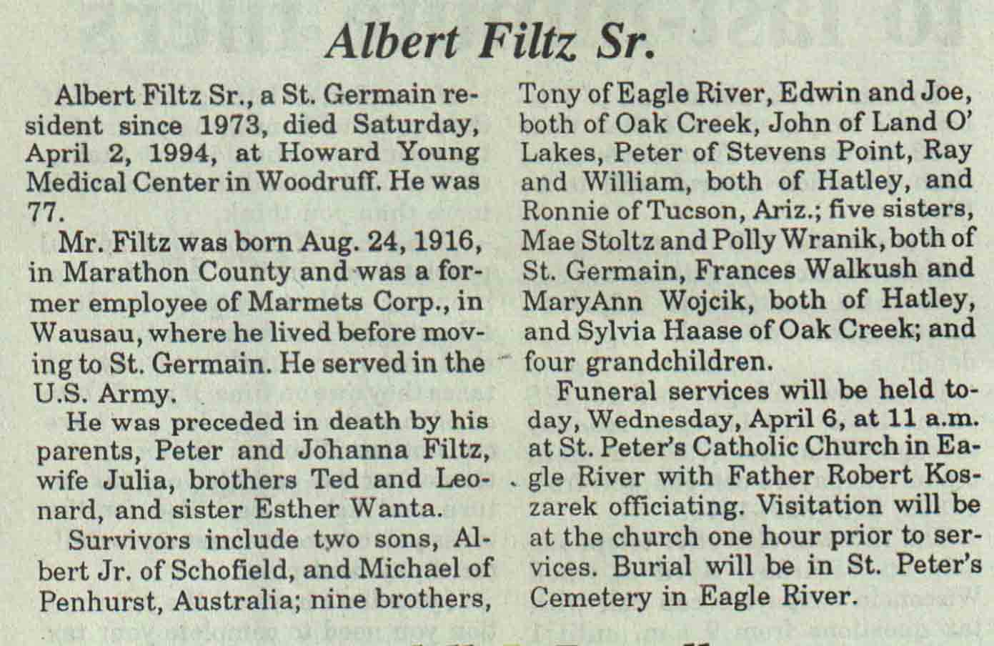 | Filtz | Albert, Sr | 24 Apr 1916 | 02 Apr 1994 | V N-R | 06 Apr 1994 | 4 |