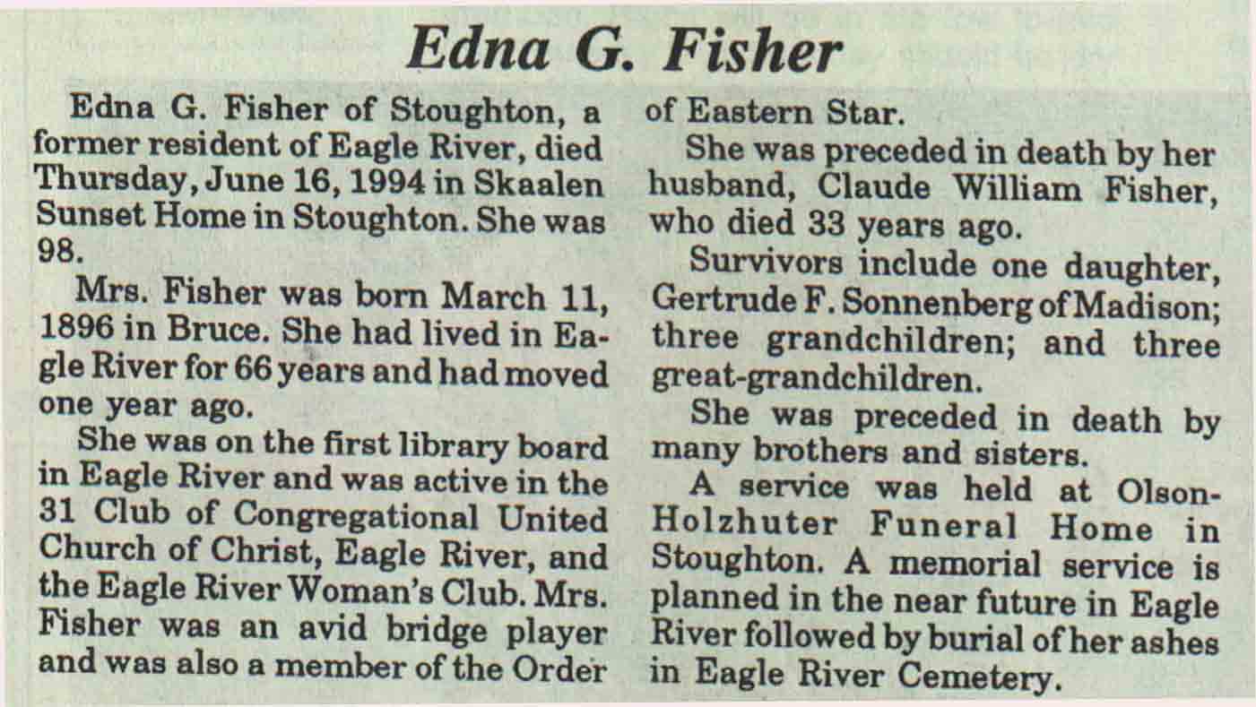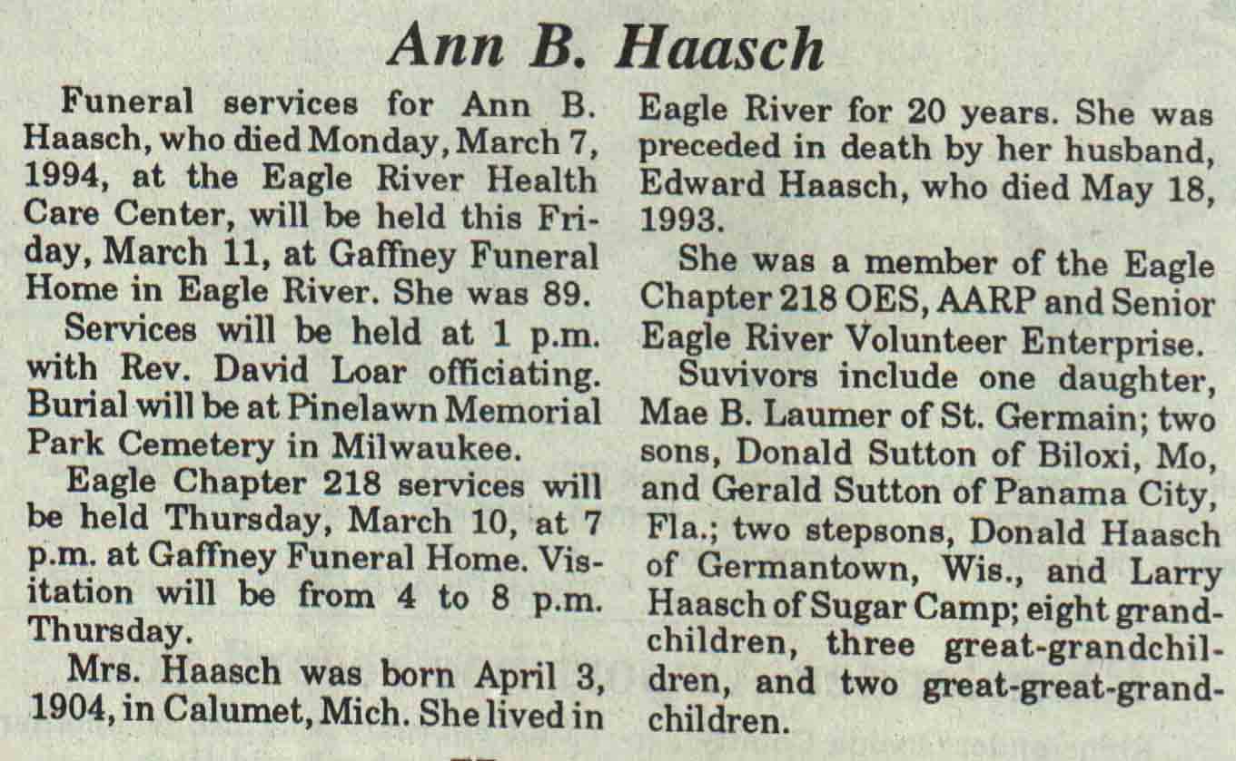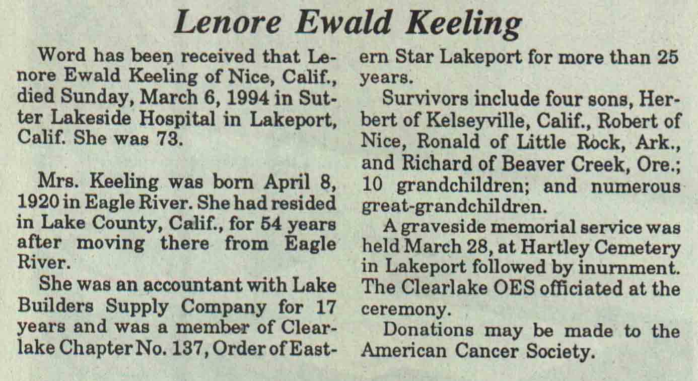 | Eckart | Caroline E | c 1901 | 29 Aug 1994 | V N-R | 07 Sep 1994 | 4 |