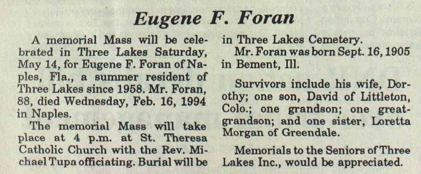 | Foran | Eugene F | 16 Sep 1905 | 16 Feb 1994 | V N-R | 11 May 1994 | 4 |