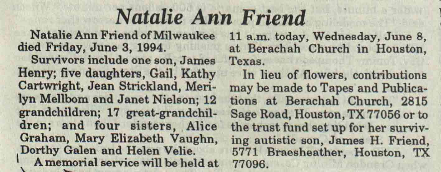 | Friend | Natalie Ann | 03 Jun 1994 | V N-R | 08 Jun 1994 | 4 | |