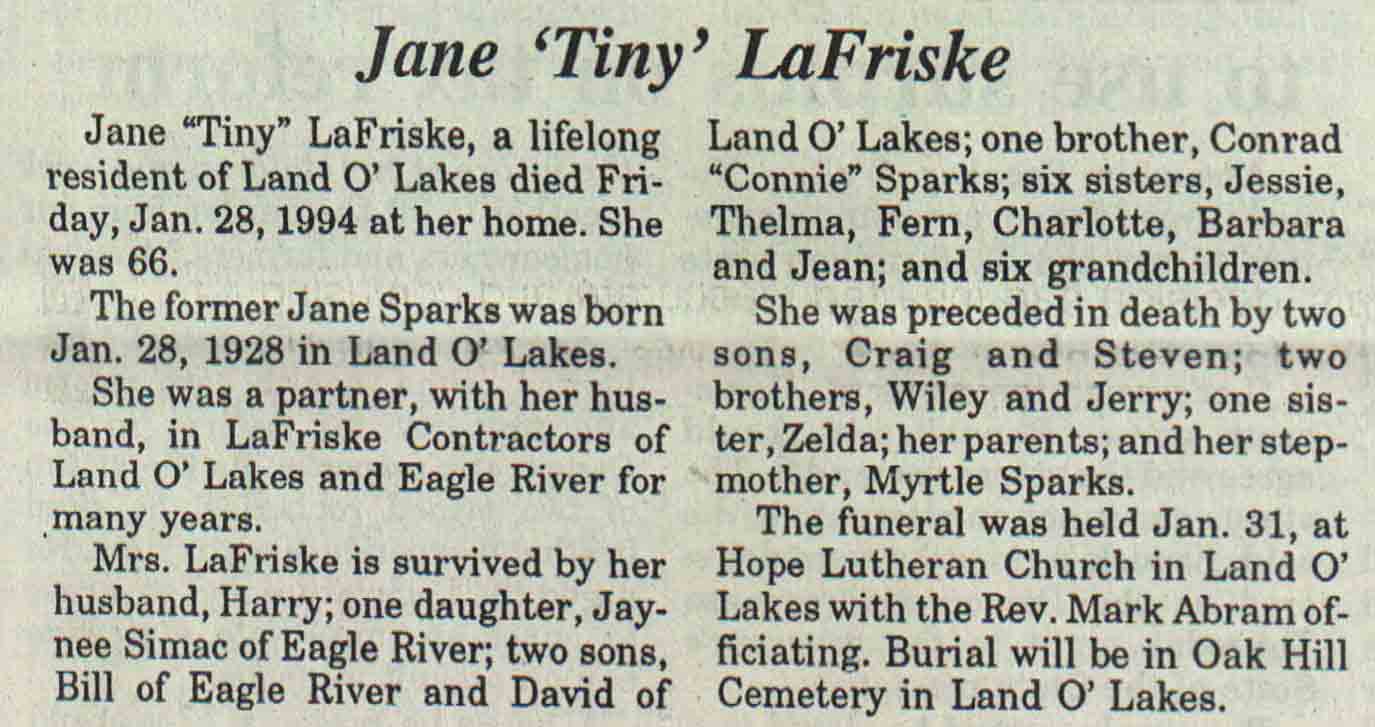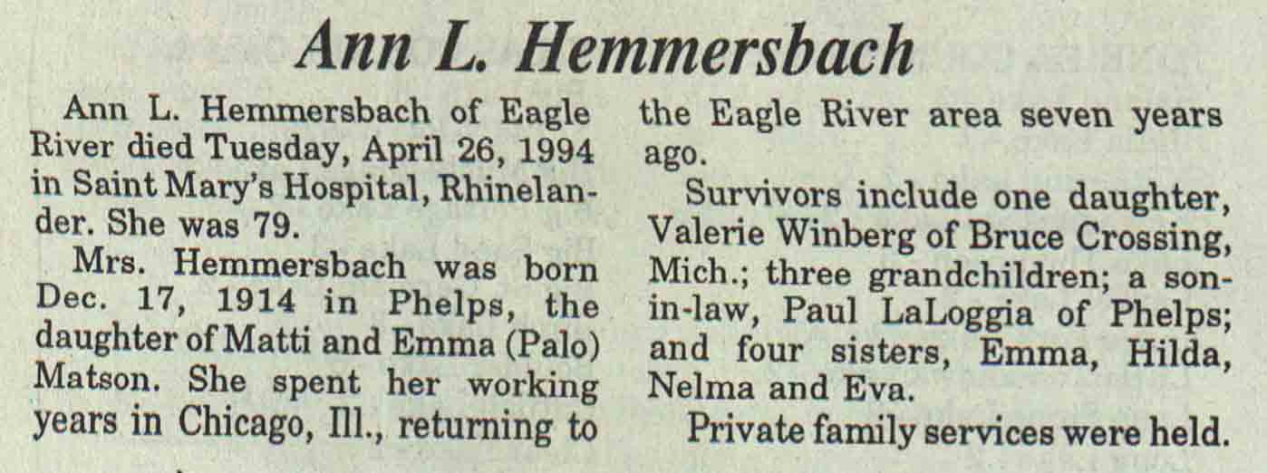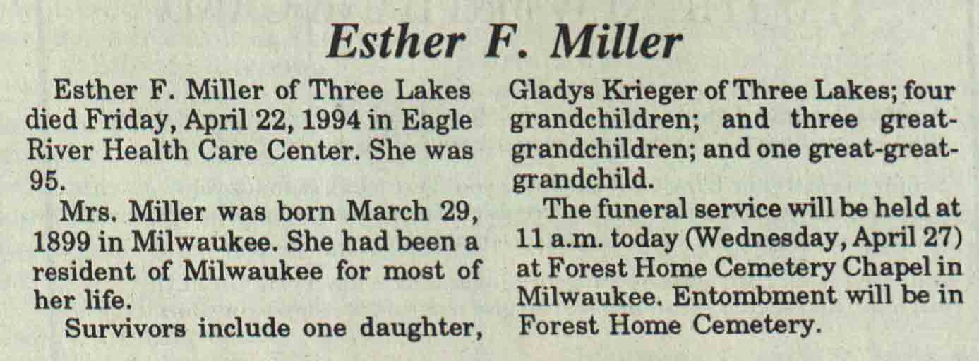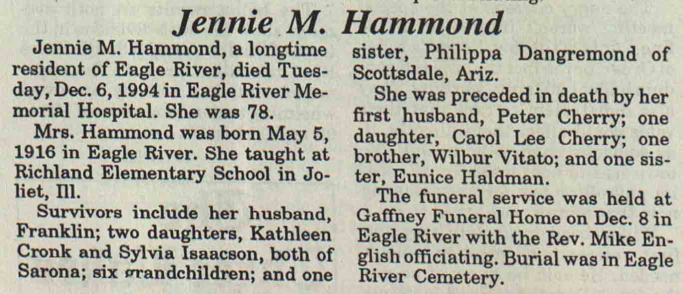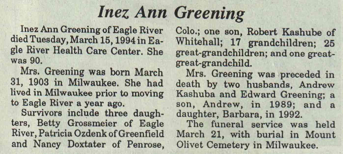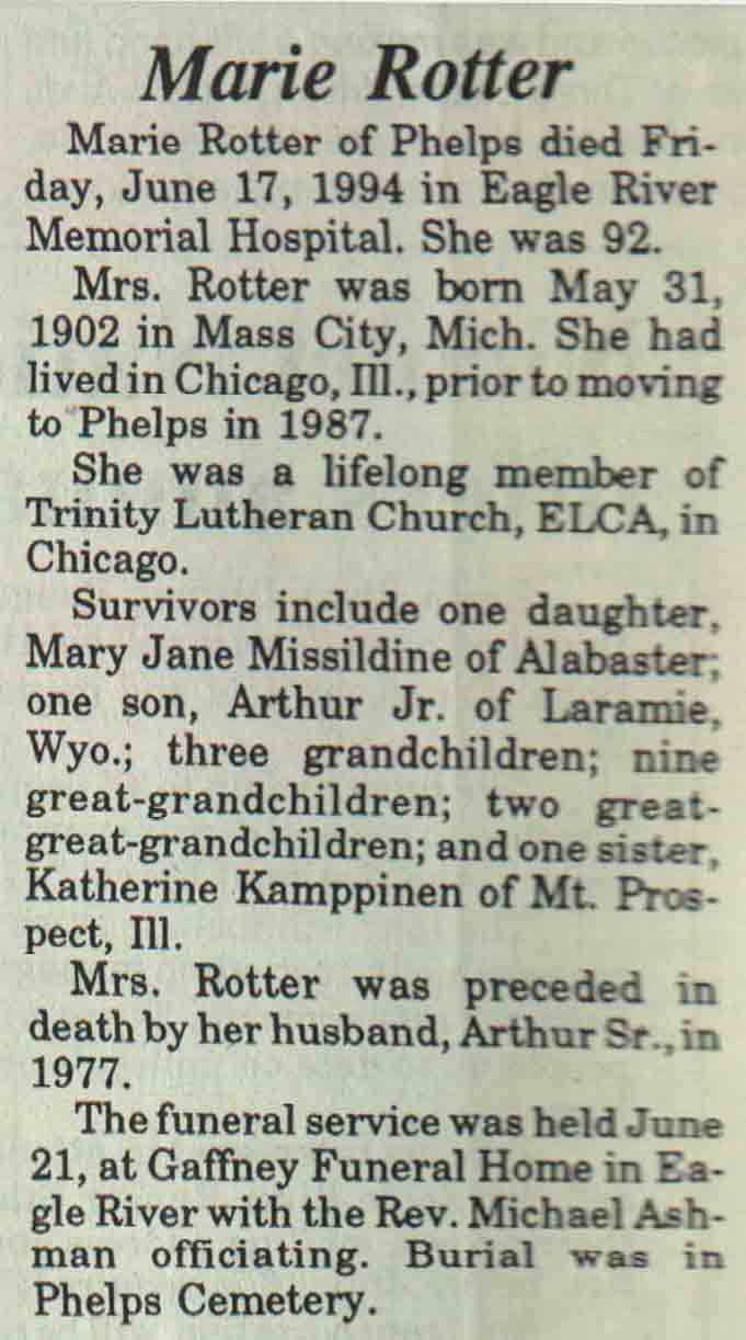 | Filppula | Lilly S | 18 Mar 1905 | 24 Apr 1994 | V N-R | 27 Apr 1994 | 4 |