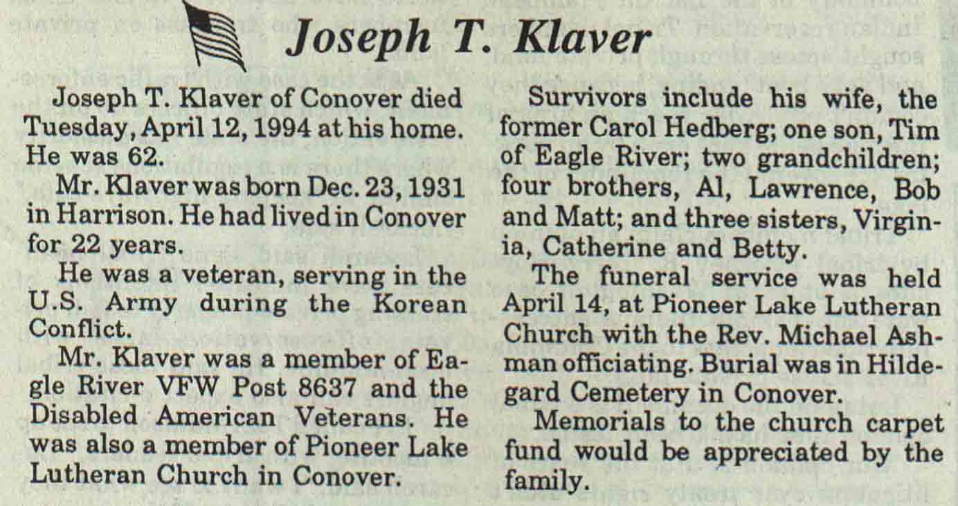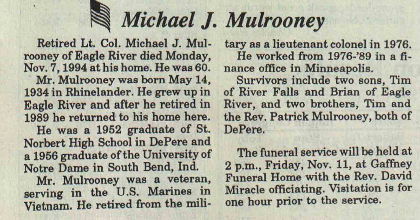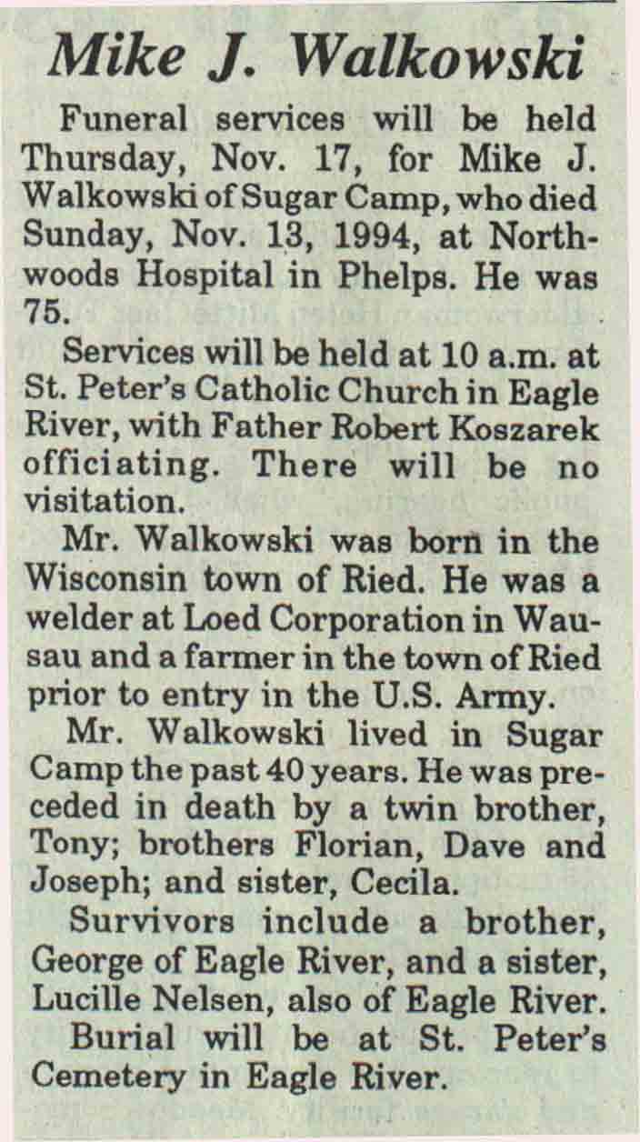 | Walkowski | Mike J | c 1919 | 13 Nov 1994 | V N-R | 16 Nov 1994 | 4 |