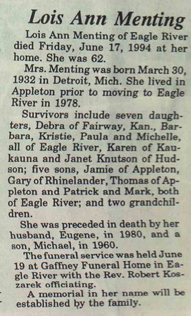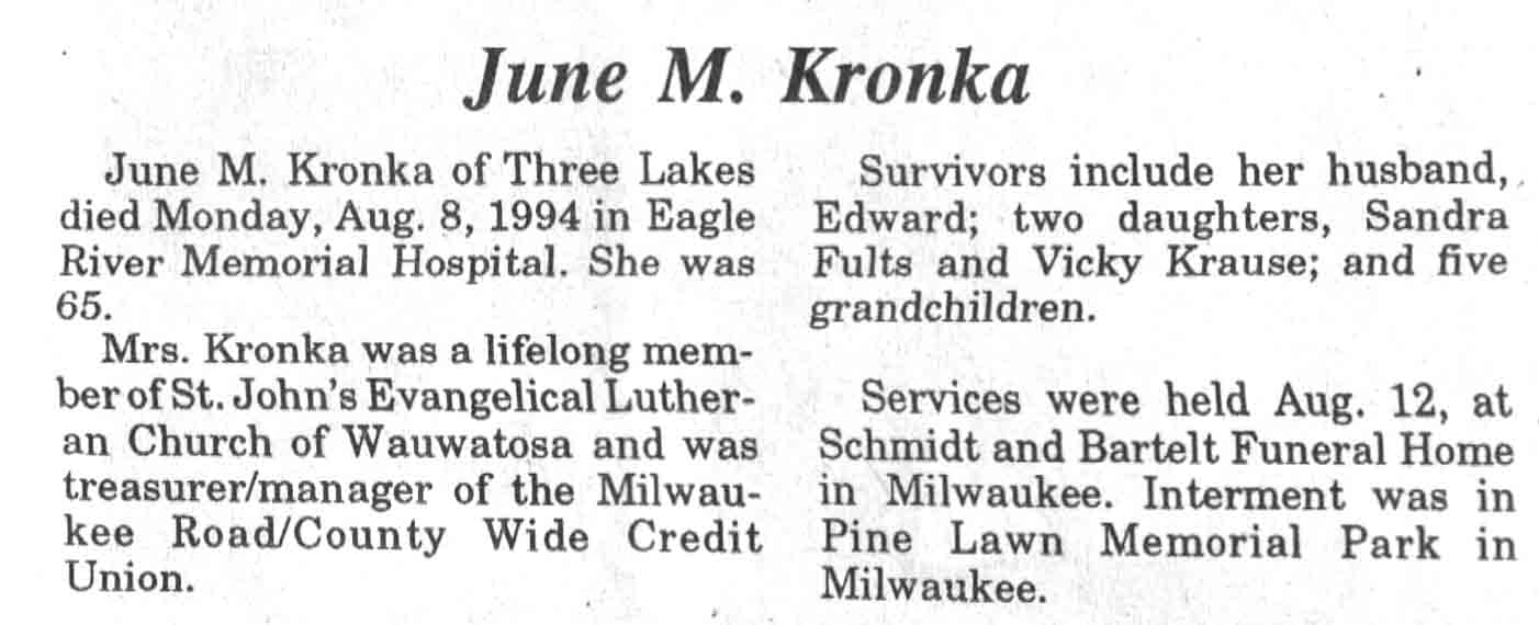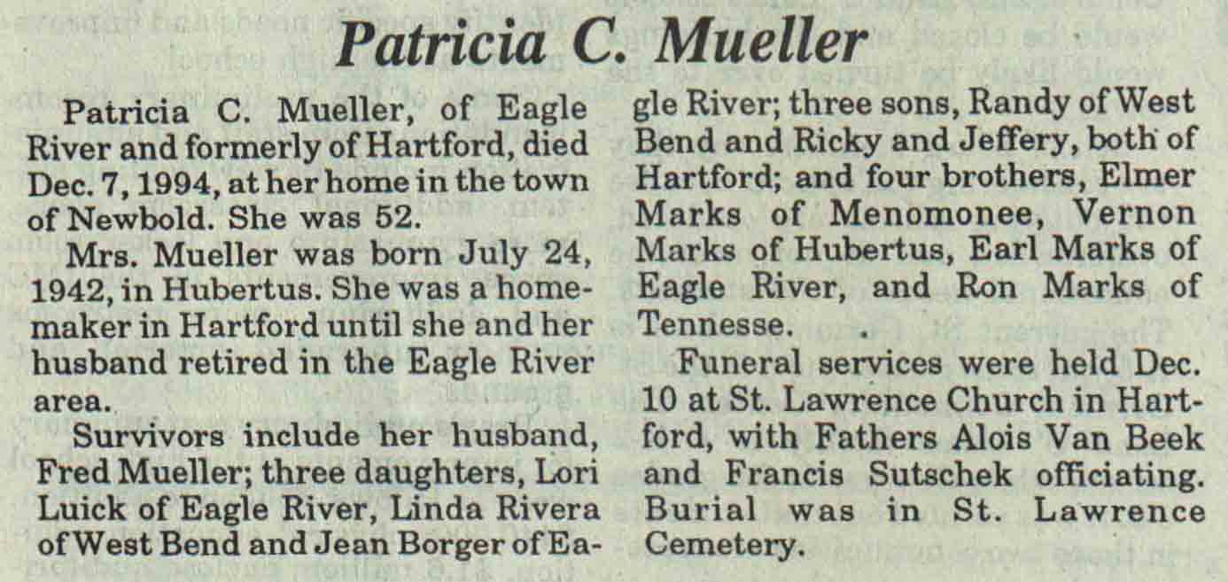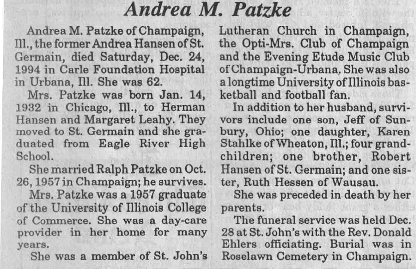 | Patzke | Andrea M | 14 Jan 1932 | 24 Dec 1994 | V N-R | 04 Jan 1995 | 4 |