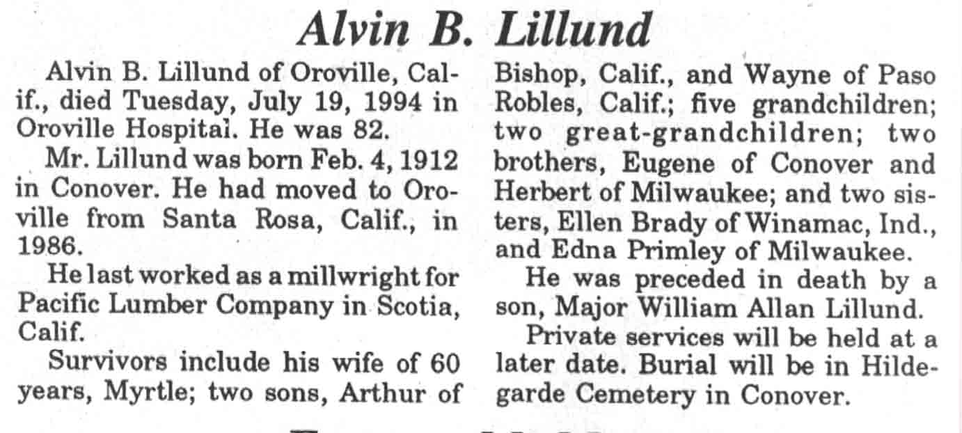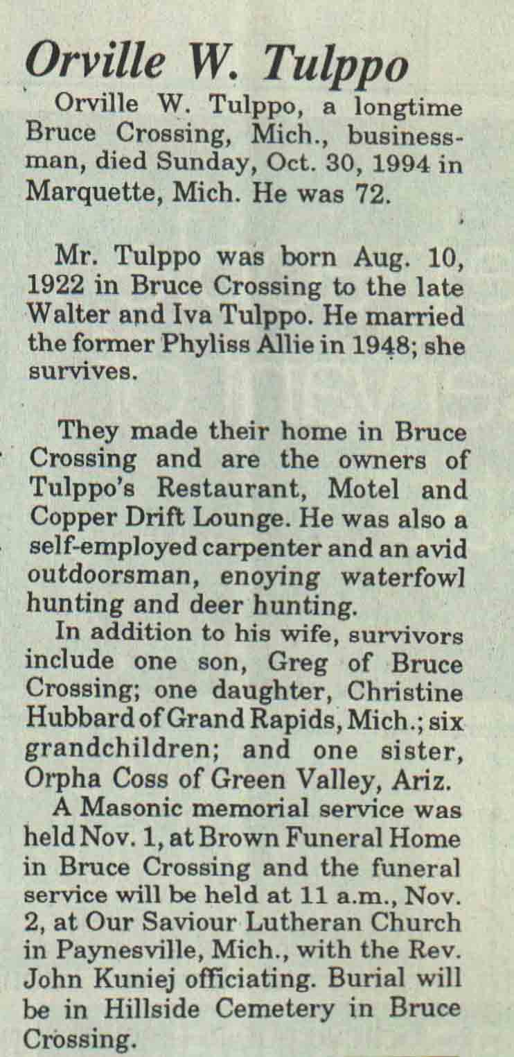 | Tulppo | Orville N | 10 Aug 1922 | 30 Oct 1994 | V N-R | 02 Nov 1994 | 4 |