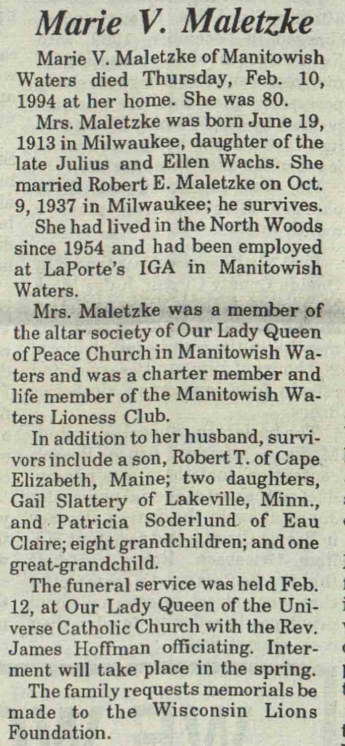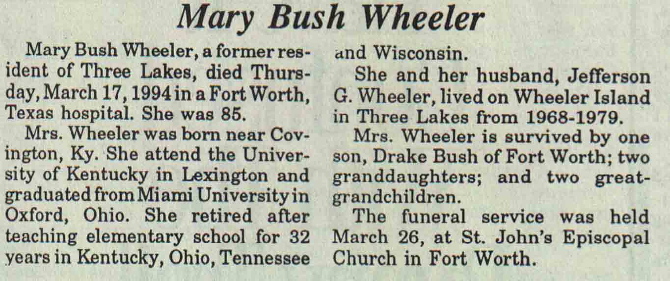 | Wheeler | Mary Bush | c 1909 | 17 Mar 1994 | V N-R | 30 Mar 1994 | 4 |