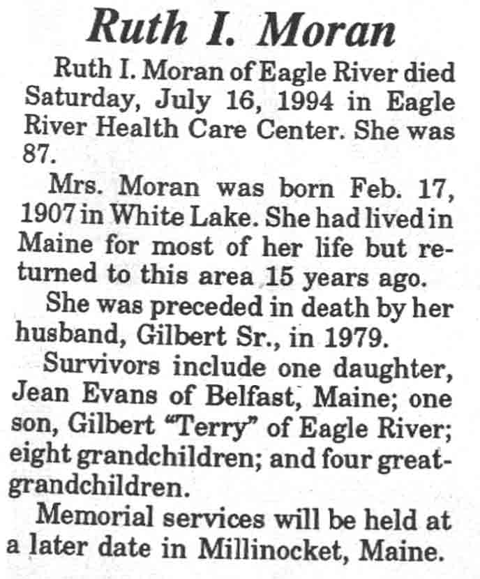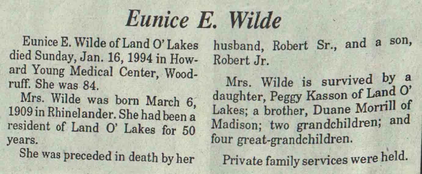 | Wilde | Eunice E (Morrill) | 06 Mar 1909 | 16 Jan 1994 | V N-R | 19 Jan 1994 | 4 |