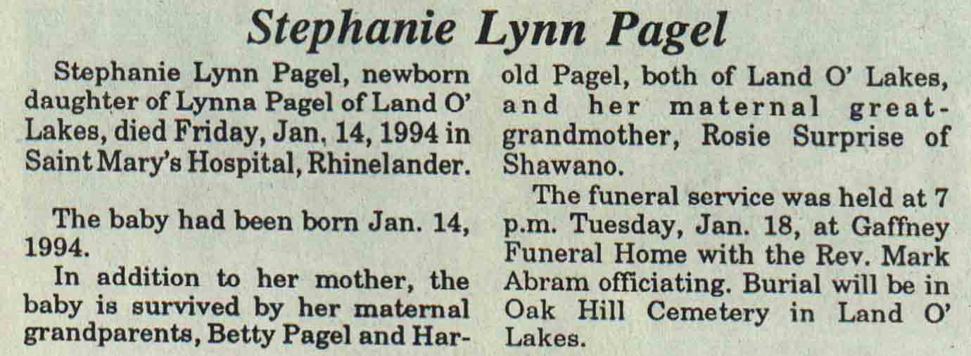 | Pagel | Stephanie Lynn | 14 Jan 1994 | 14 Jan 1994 | V N-R | 19 Jan 1994 | 4 |