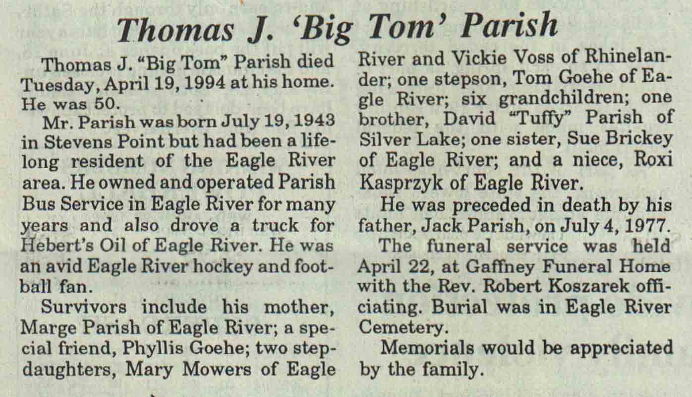 | Parish | Thomas J 'Big Tom' | 10 Jul 1943 | 19 Apr 1994 | V N-R | 04 May 1994 | 4 |