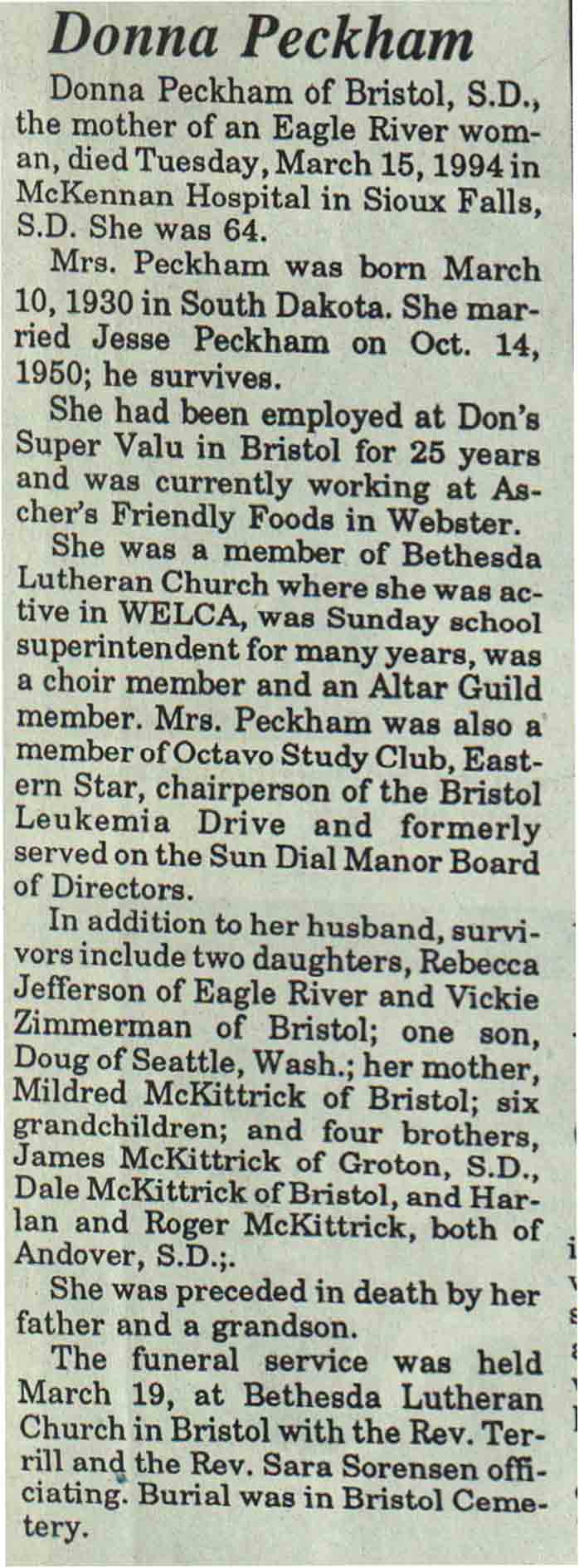| Peckham | Donna (McKittrick) | 10 Mar 1930 | 15 Mar 1994 | V N-R | 23 Mar 1994 | 4 |