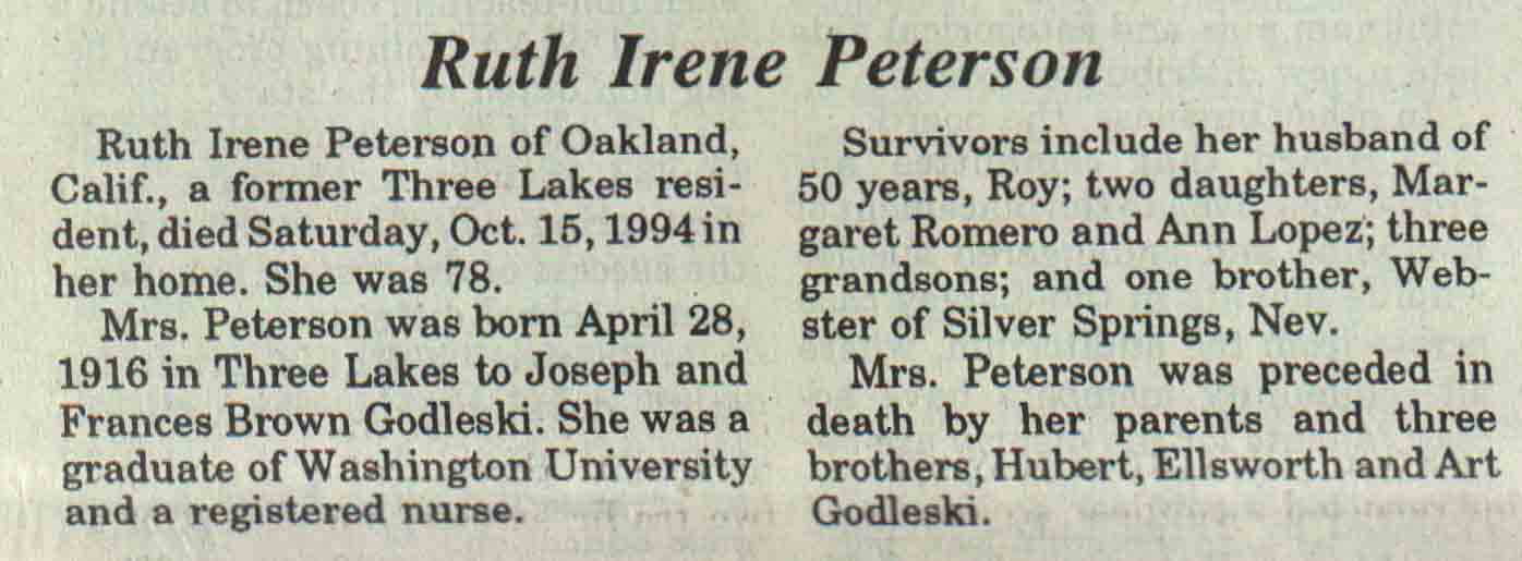 | Peterson | Ruth Irene (Godleski) | 28 Apr 1916 | 15 Oct 1994 | V N-R | 26 Oct 1994 | 4 |