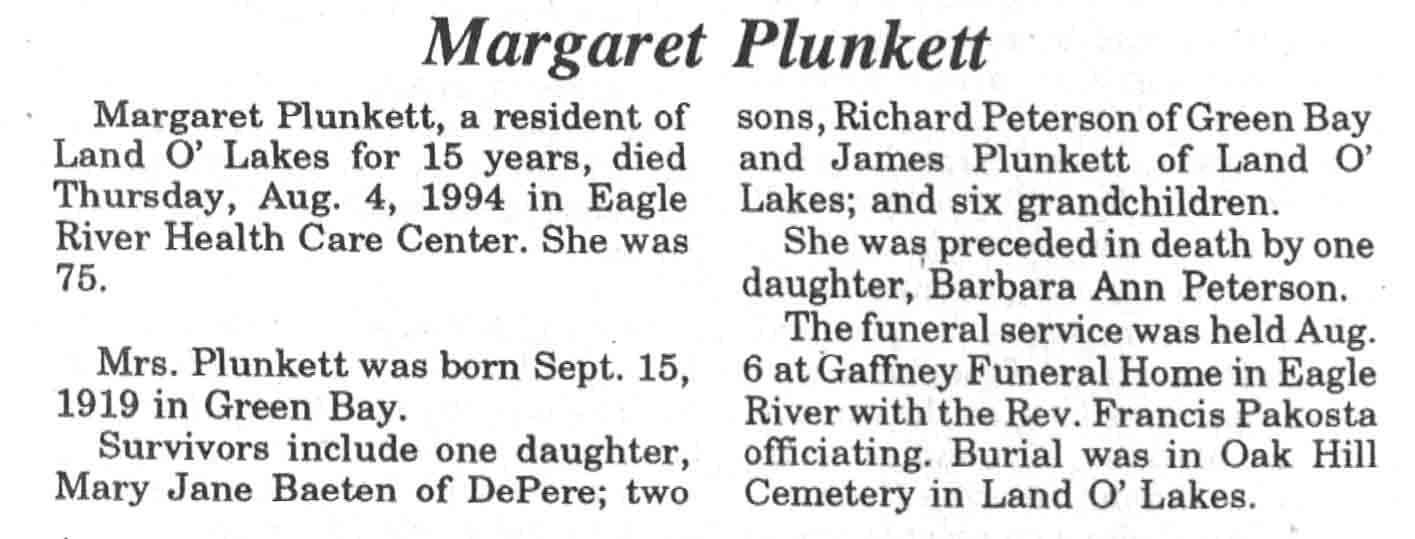 | Plumkett | Margaret | 15 Sep 1919 | 04 Aug 1994 | V N-R | 10 Aug 1994 | 4 |